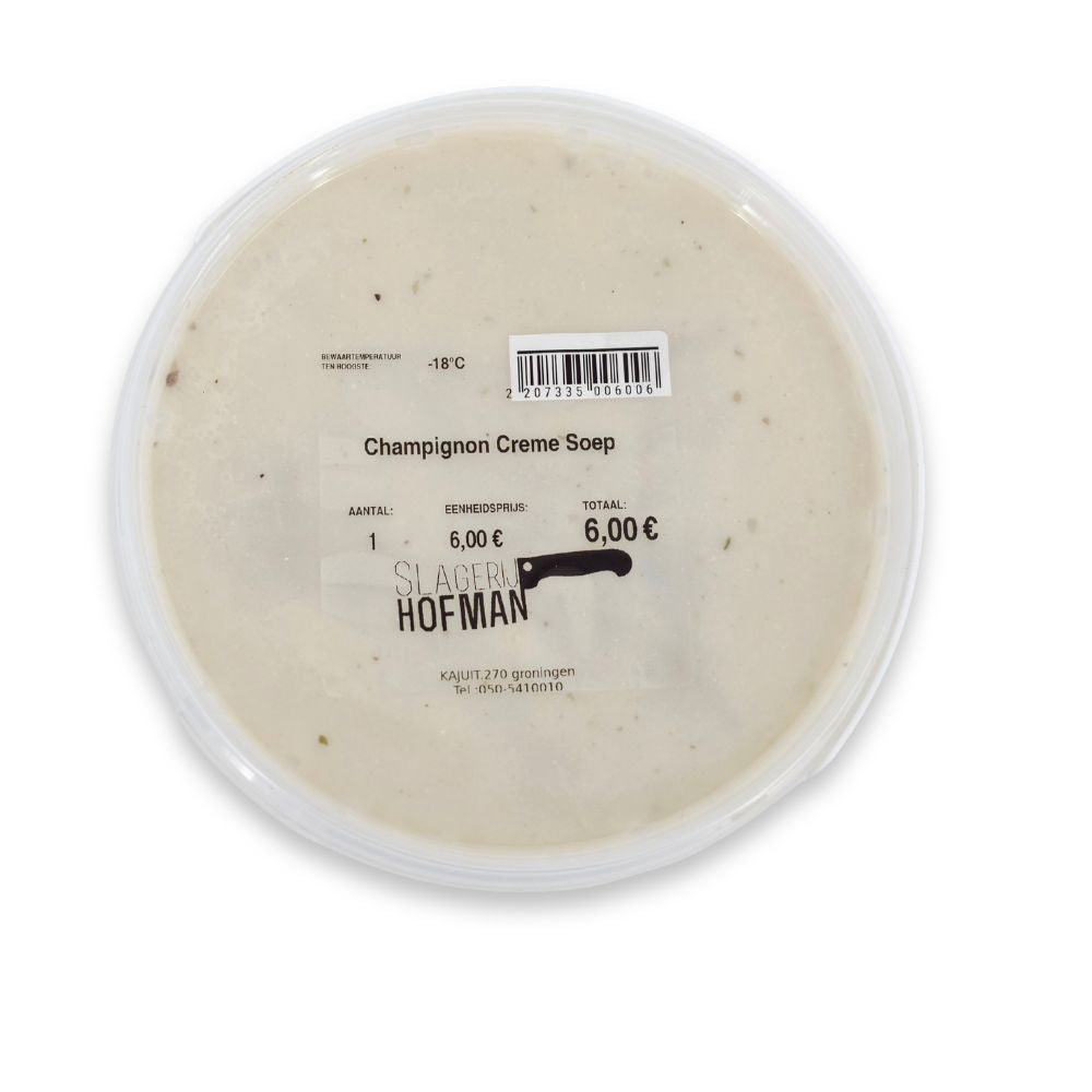 Heerlijk romig en vol verse champignons! Deze huisgemaakte soep van slager René Hofman wordt met liefde bereid in eigen keuken. Een fluweelzachte traktatie, puur en eerlijk van de vakman uit Groningen. Even opwarmen en je geniet direct van een ambachtelijk kommetje soep. Dat smaakt naar meer!