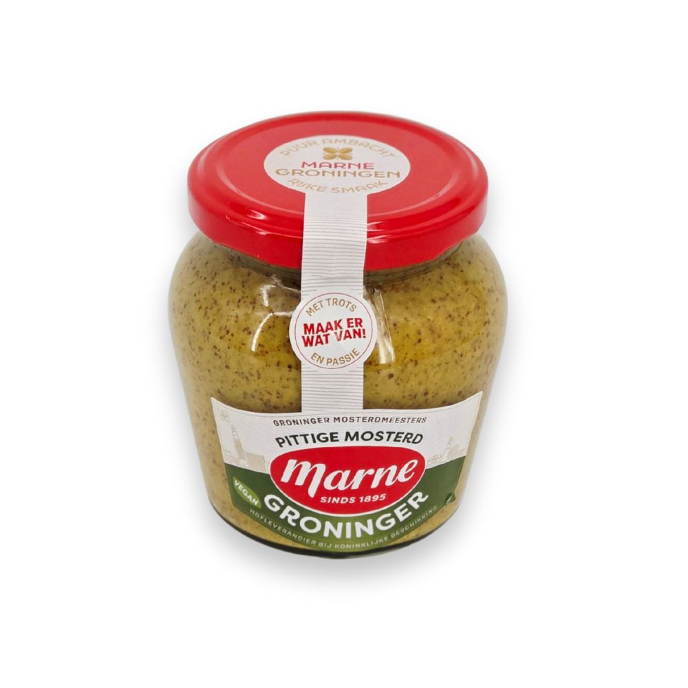 Proef de trots van het Noorden! Deze heerlijke grove mosterd van Marne wordt nog steeds volgens authentiek recept gemaakt. Vandaag vers opgehaald bij de mosterd-makerij, morgen bij jou op tafel. Pittig, eerlijk en onmisbaar bij een Groninger bitterbal of door de soep. Echt vakmanschap uit onze eigen regio!