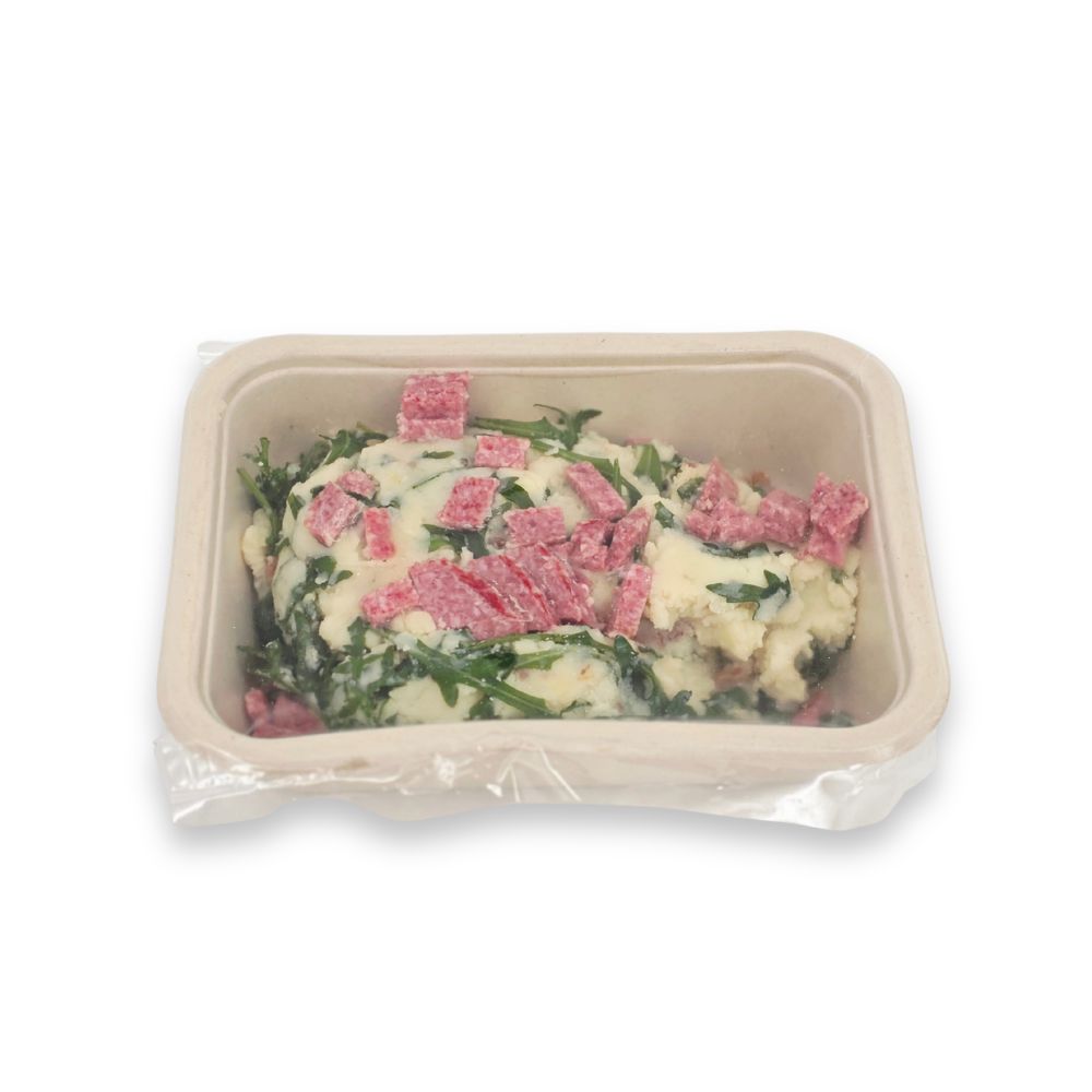 Haal de zon in huis met deze Italiaanse stamppot! Vers en ambachtelijk bereid door de mensen van Slagerij René Hofman uit Groningen. Een verrassende combinatie van Hollandse aardappelen en mediterrane smaken, natuurlijk met een stukje vlees. Bereid met Rucola, Salami, Mozzarella, Zon gedroogde tomaten en Aardappel puree. Even opwarmen en smullen maar!