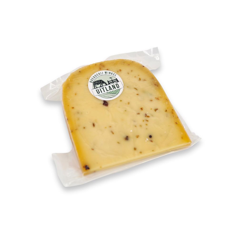 Deze ambachtelijke boeren rauwmelkse kaas van Boerderij Uitland is een ware smaaksensatie. De warme tonen van komijn en kruidnagel vormen een heerlijke combinatie met de romige zuivel. Vers van de boerderij in Buitenpost, vandaag bij de boerin opgehaald en morgen al bij jou op de borrelplank. Dat is pas eerlijk genieten!