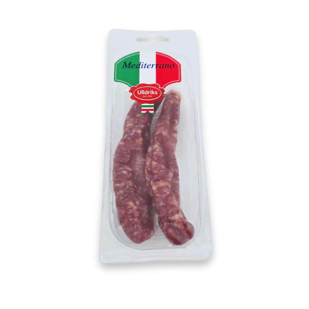 Haal de zon in huis met de kruidige Mediterrano droge worst van slagerij Uildriks! Ambachtelijk bereid door de vakmensen van De Worstenwinkel met een vleugje zuidelijke flair. Een eerlijk en smaakvol streekproduct, perfect voor bij de borrel. Direct van de boer, met passie gemaakt. Dat proef je meteen!